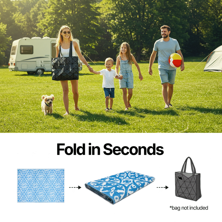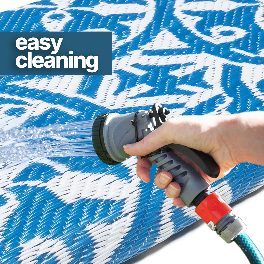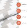 – gemaakt van duurzaam recyclebaar materiaal – OEKO-TEX gecertificeerd, bevat geen schadelijke stoffen – zeer duurzaam en gemakkelijk te onderhouden – water- en weerbestendig, verkleurt niet – gemakkelijk te vouwen – dubbelzijdig – ideaal voor: terras, patio, balkon, picknick, strand, camping